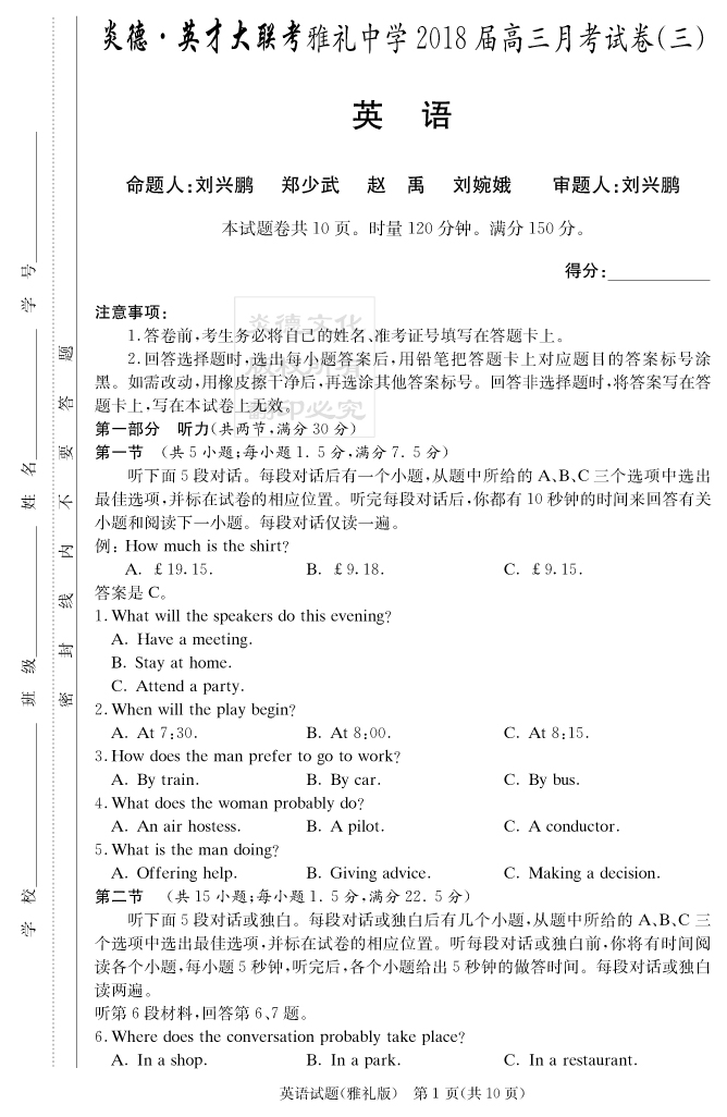 【英語】炎德英才大聯考2018雅禮中學高三3次月考