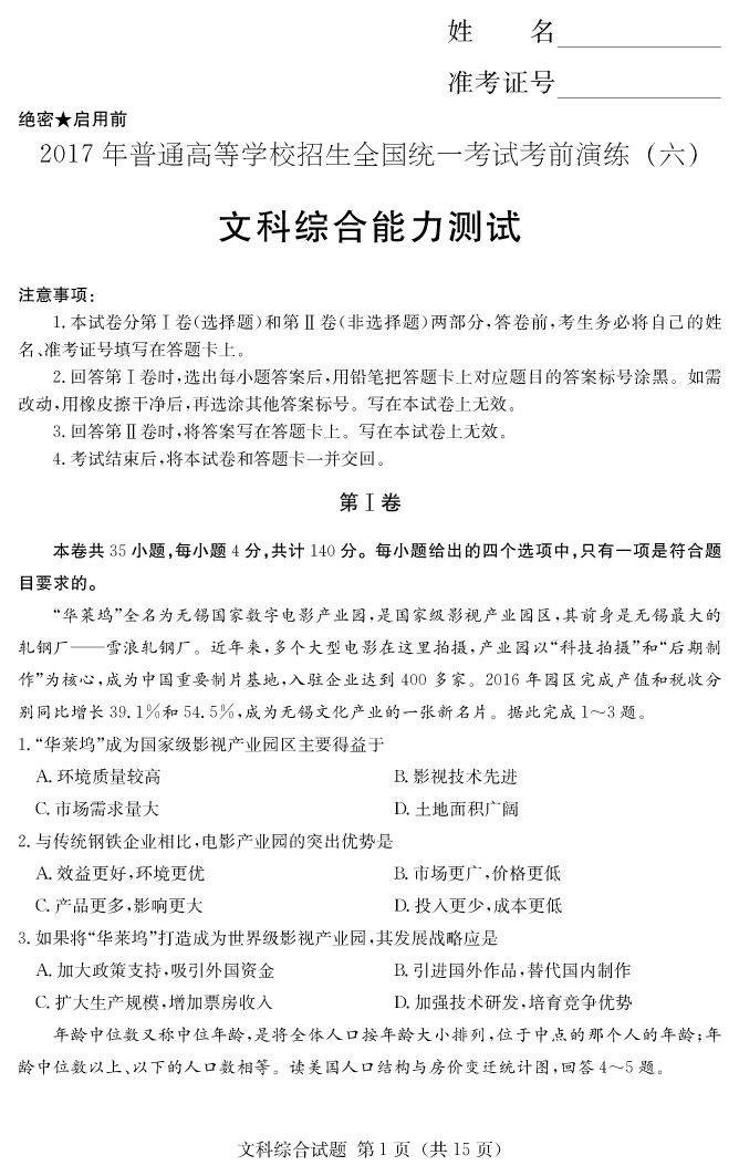 【文綜】2017年普通高等學校招生全國統一考試考前演練(六)
