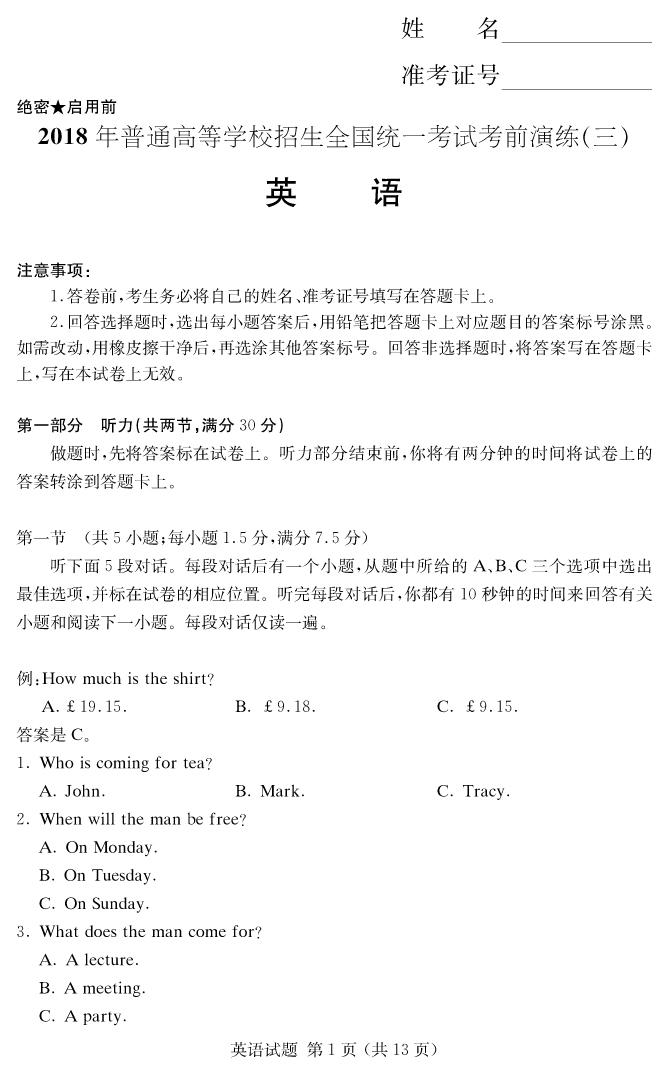 【英語】2018年普通高等學校招生全國統一考試考前演練(三)