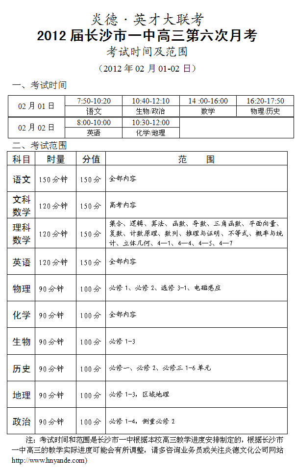 炎德英才大聯考長沙市一中2012屆高三第六次月考考試時間和范圍