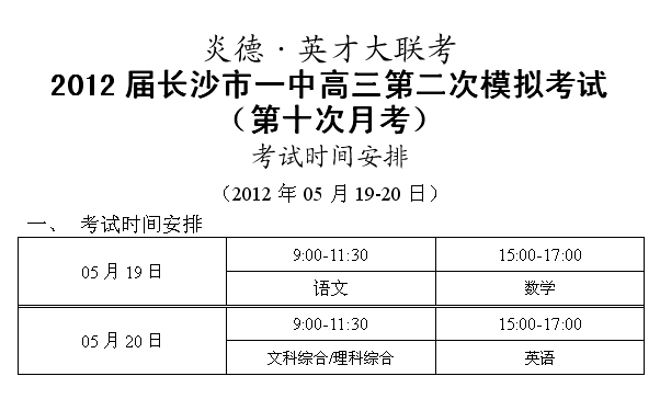 炎德英才大聯(lián)考長(zhǎng)沙市一中2012屆高三第二次模擬(第十次月考)考試時(shí)間和范圍