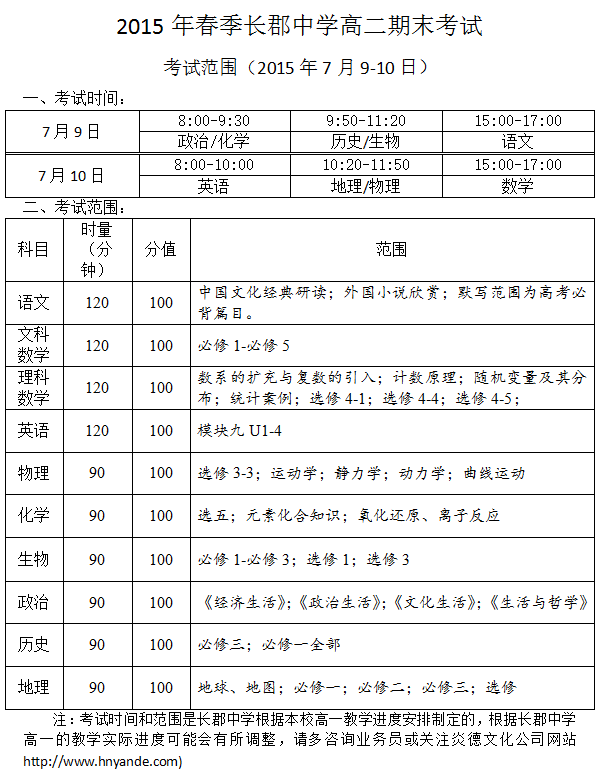 2015年春季長郡中學(xué)高二期末考試考試范圍(2015年7月8-10日)