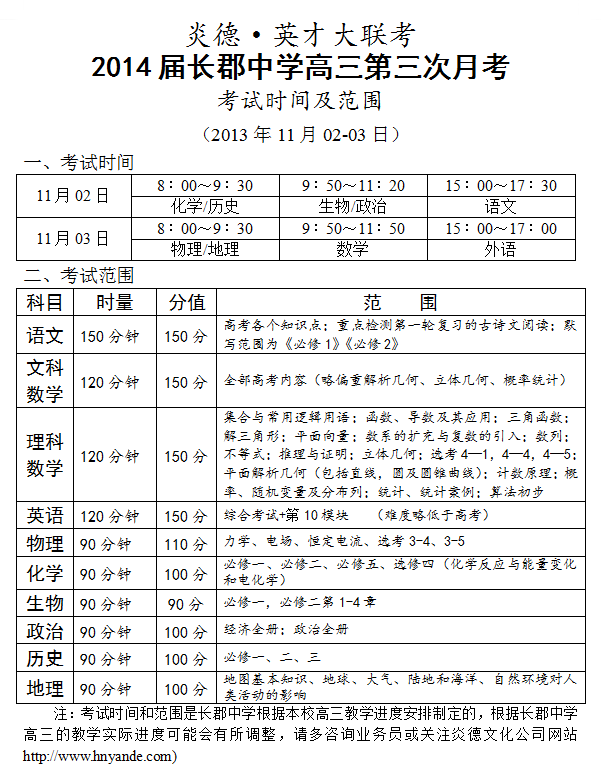 炎德英才大聯考長郡中學2014屆高三第3次月考考試時間和范圍(2013.11.02-03)