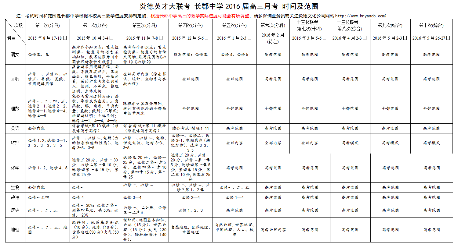炎德英才大聯考長郡中學2016屆高三月考考試時間和范圍