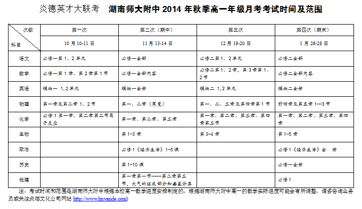 炎德英才大聯(lián)考師大附中2014年秋季湖南師大附中高一第1-4次月考考試時(shí)間和范圍(2014.10-2015.02)