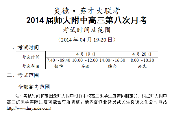 炎德英才大聯(lián)考師大附中2014屆高三第8次月考考試時(shí)間和范圍(2014.04.19-20)