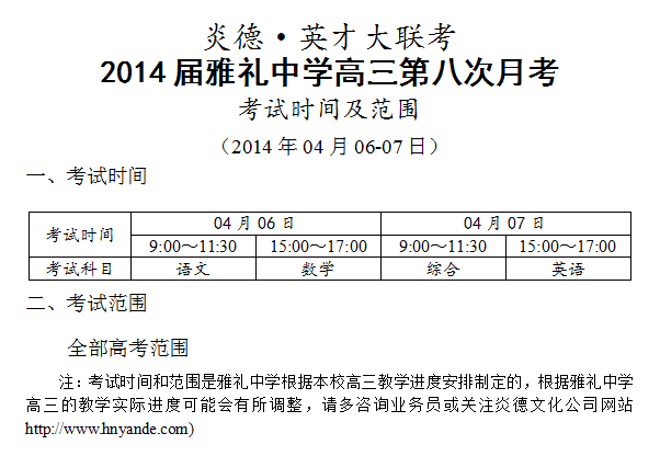 炎德英才大聯考雅禮中學2014屆高三第8次月考考試時間和范圍(2014.04.06-07)