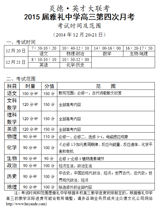 上一篇:炎德英才大聯考雅禮中學2015屆高三第3次月考考試時間和范圍(2014.11.17-18)
