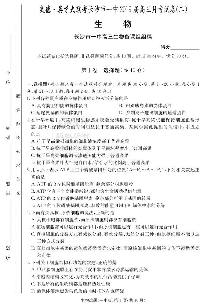 2026湖南師大附中新高考考前小題訓練·生物