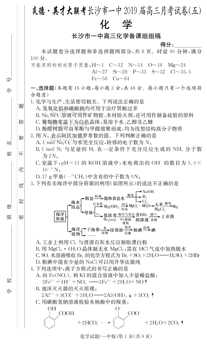 【化學(xué)】炎德英才大聯(lián)考2019長沙一中高三5次月考