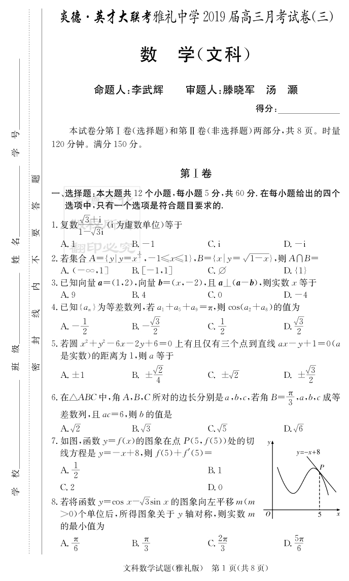 【文數】炎德英才大聯考2019雅禮中學高三3次月考
