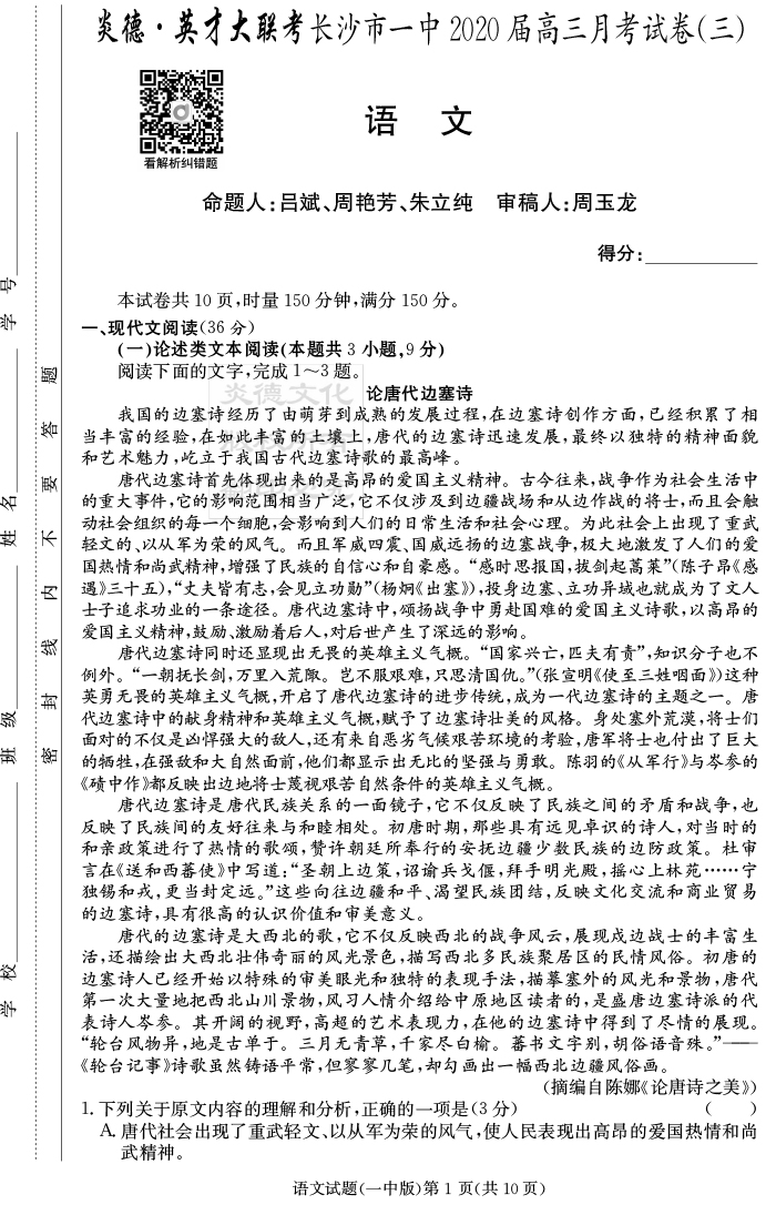 2026湖南師大附中新高考考前小題訓練·語文