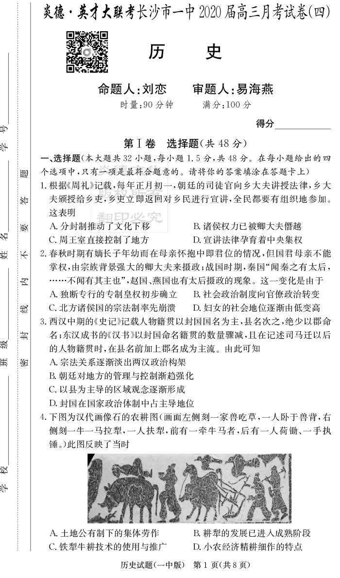 【歷史】炎德英才大聯考2020屆長沙市一中高三4次月考