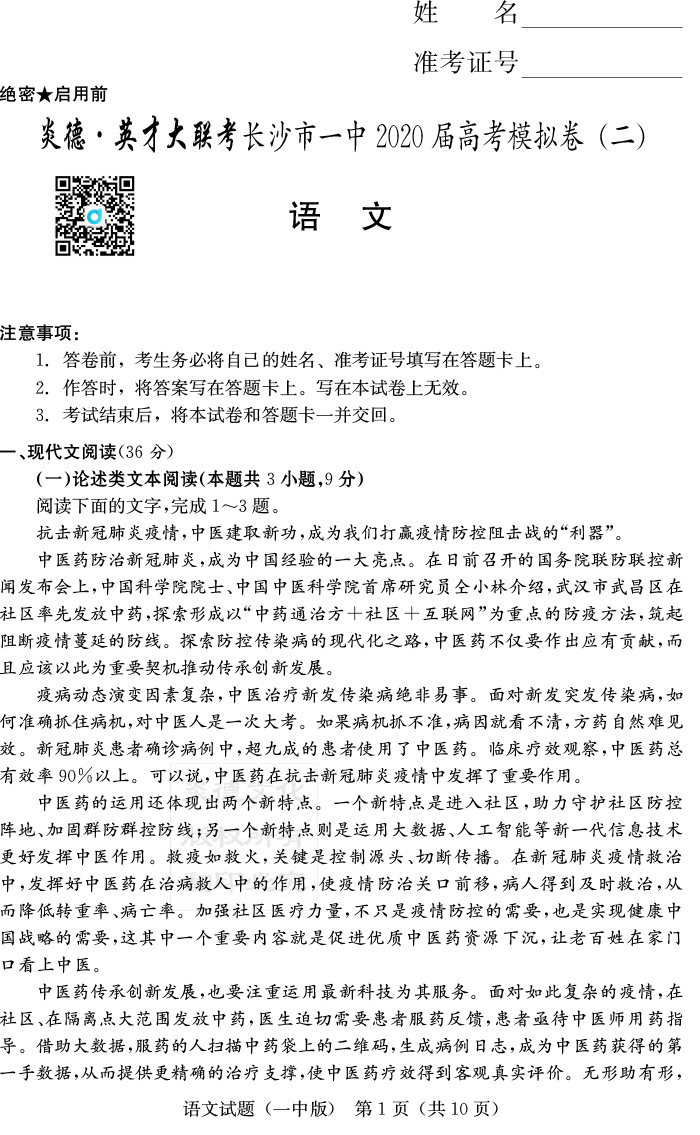 【語文】炎德英才大聯考2020屆長沙市一中高三10次月考(模擬二)
