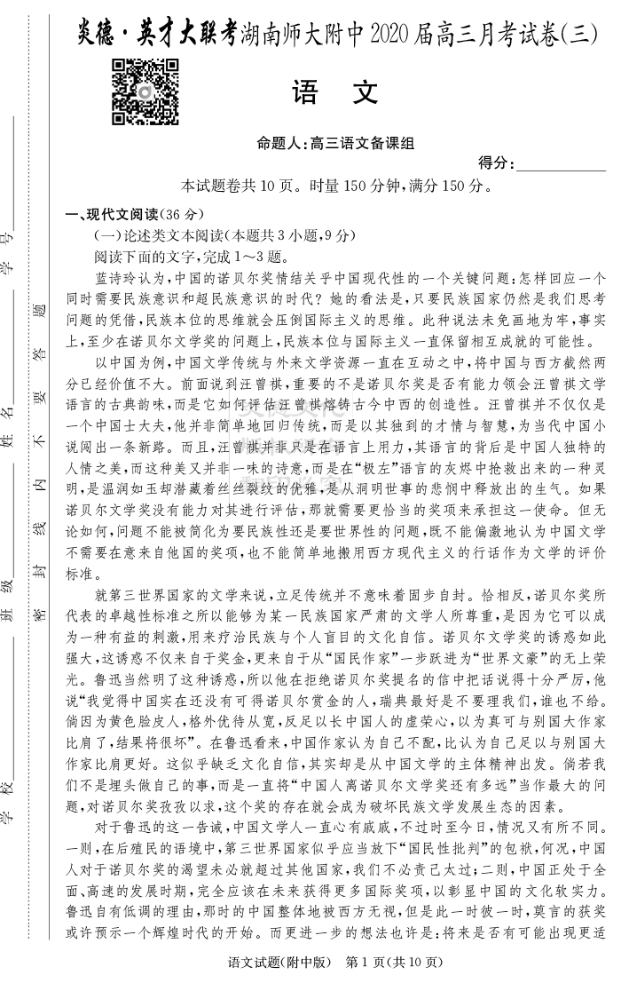 2026湖南師大附中新高考考前小題訓練·語文