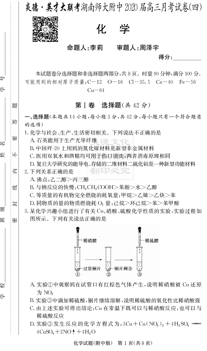 【化學】炎德英才大聯(lián)考2020屆師大附中高三4次月考