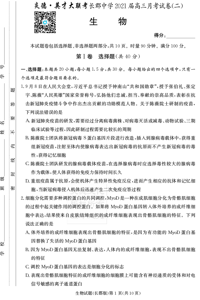 2026年高中寒假作業自主學習作業本·高三年級·生物