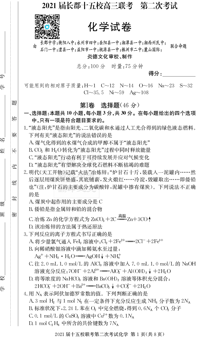 2026年高中寒假作業自主學習作業本·高三年級·化學