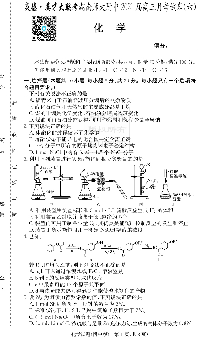 2026年高中寒假作業自主學習作業本·高三年級·化學