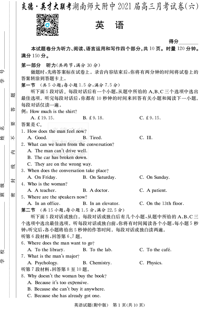 2026湖南師大附中新高考考前小題訓練·英語