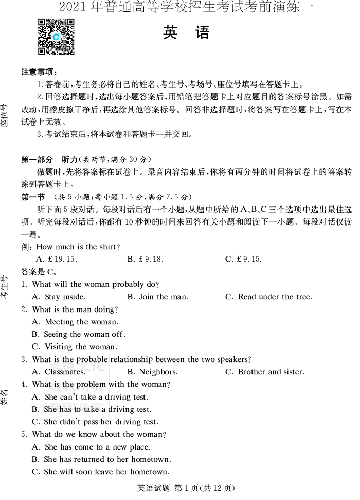 下一篇:【語文】2021年普通高等學校招生全國統一考試考前演練(一)