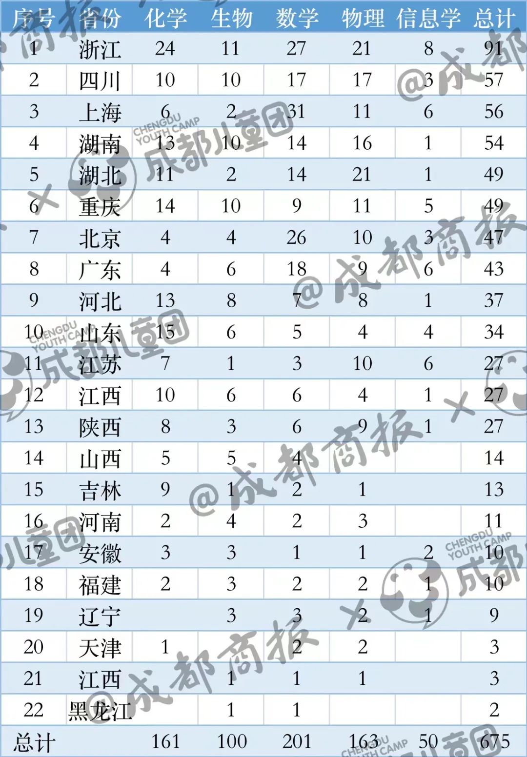 再來看排在二三四位置的四川、上海和湖南,三個省市的金牌總數均突破50枚大關,成績算是相當不錯了。學科方面,上海主要是在數學方面比較突出,至于其它學科的話則相對較弱,偏科稍微顯得比較嚴重。至于四川和湖南,兩個省份都在數學、物理、化學和生物四大科目均取得了金牌數兩位數的成績,實力耀眼。